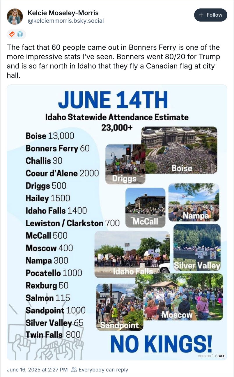 Bonners Ferry has a population of 2,697 and went to Trump 80/20; 60 people showed up to say #NoKings.
